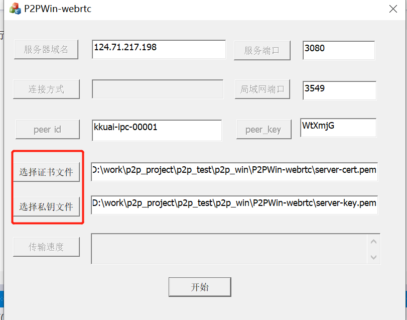 运行之前您需要再官网下载免费的云端服务自行进行部署,服务器域名填写实际的ip地址或者域名,然后点击选择dtls通信需要的数字证书(工程源码里面已经附带),然后点击开始,此时demo即开始监听浏览器webrtc发过来的请求。