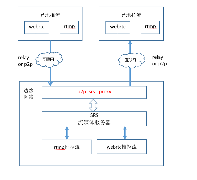 p2p_srs_proxy是流媒体p2p网关,和srs流媒体服务部署在同一个边缘网络中,也可以部署在同一台机器。如果是边缘网络内的推拉流,可以直接和srs流媒体服务进行交互;如果是异地网络的推拉流,直接和p2p_srs_proxy交互。如果异地推拉流客户端和p2p_srs_proxy之间p2p通道创建成功,则数据不需要经过云端中转;如果p2p通道创建不成功,则数据会经过P2P系统的云端进行中转。