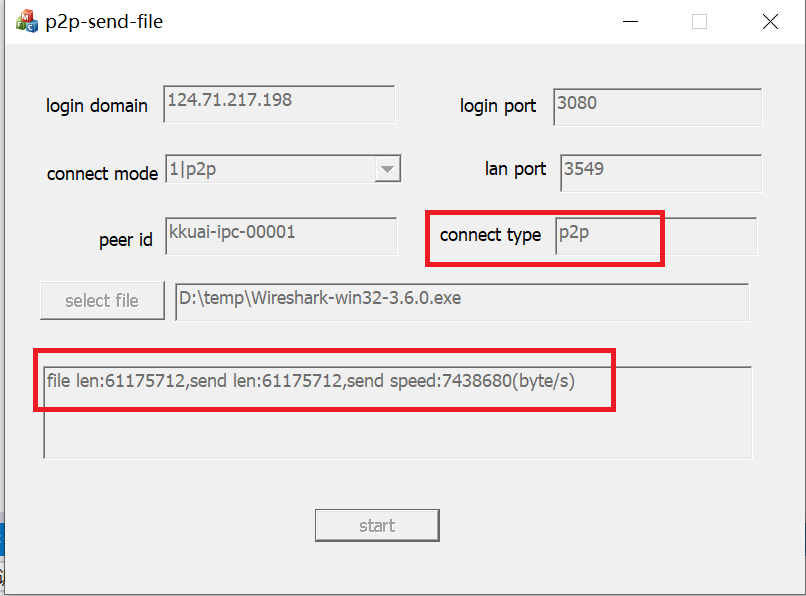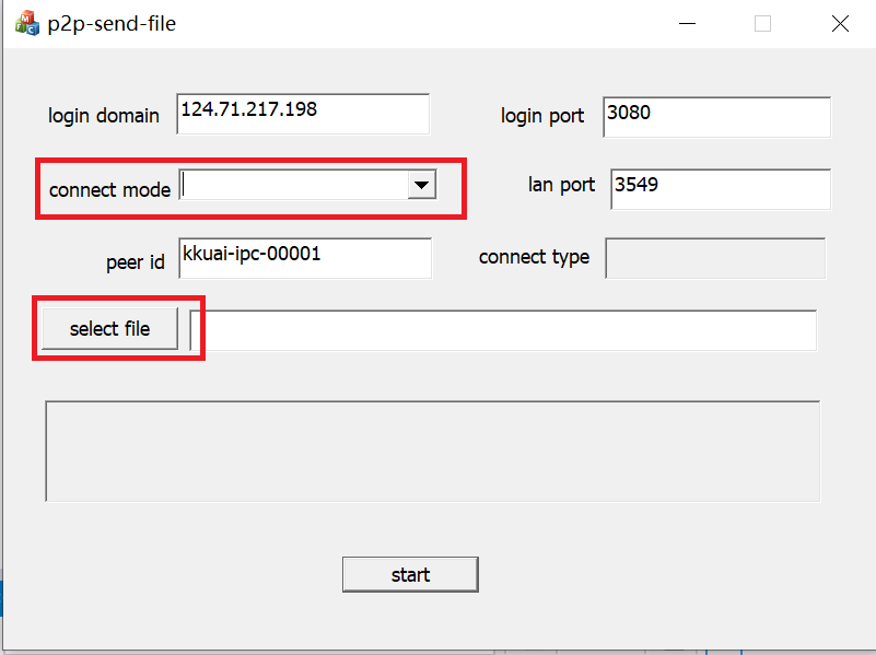 工具启动页面如上,有些默认参数是代码写死的,可以自行修改。下拉列表选择连接模式,有自动模式,p2p模式,中转模式,局域网搜索模式可供选择,然后再点击选择文件的button,可以选择一个文件发送。