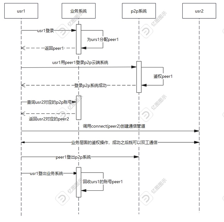 当usr1要和usr2通信时候,usr1到业务系统查询usr2对应的登录账号为peer2,然后调用中间件的connect(peer2)创建通信管道;管道创建成功之后,根据需要usr1向usr2发送业务相关的鉴权信息,usr2对信息进行校验,校验通过则允许双工通信,否则直接关闭连接。