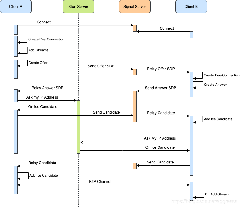 如上图所示,webrtc建立连接是一个比较复杂的过程,简单描述就是通过信令系统交换通信双方的ip、port信息,如果能p2p直连成功就直连,如果不能直接建立p2p连接则通过中转服务器建立连接。库快科技的p2p sdk内部已经完成上述复杂的建连过程,用户不需要进行开发,直接关注业务层音视频采集发送即可。