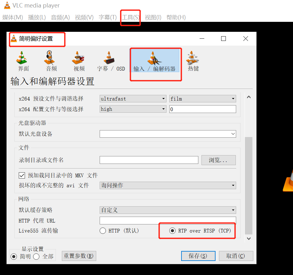 6、修改vcl播放器的配置,将vlc的rtsp传输模式改为tcp模式,如下所示
