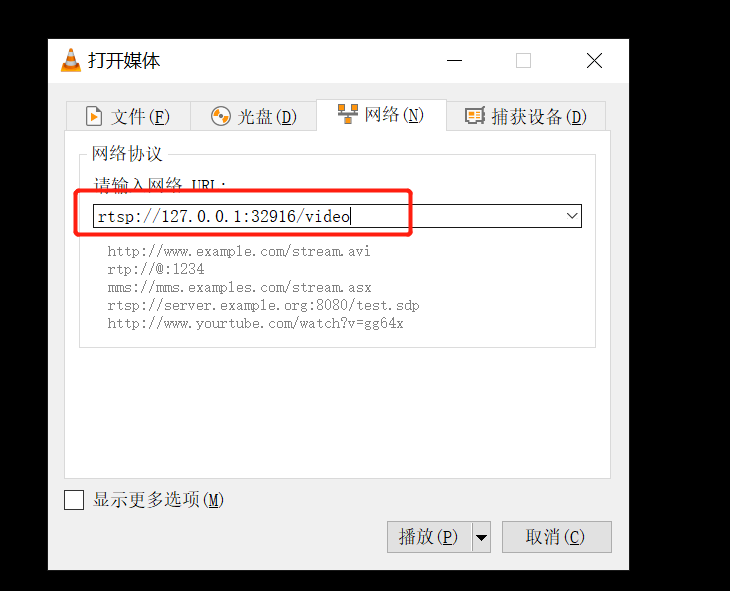 7、用vlc播放rtsp流媒体地址,如下所示: